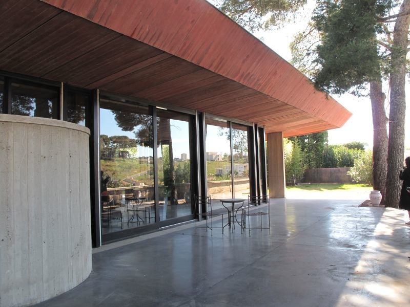 Structure en béton brut, bois et verre, aux lignes modernistes