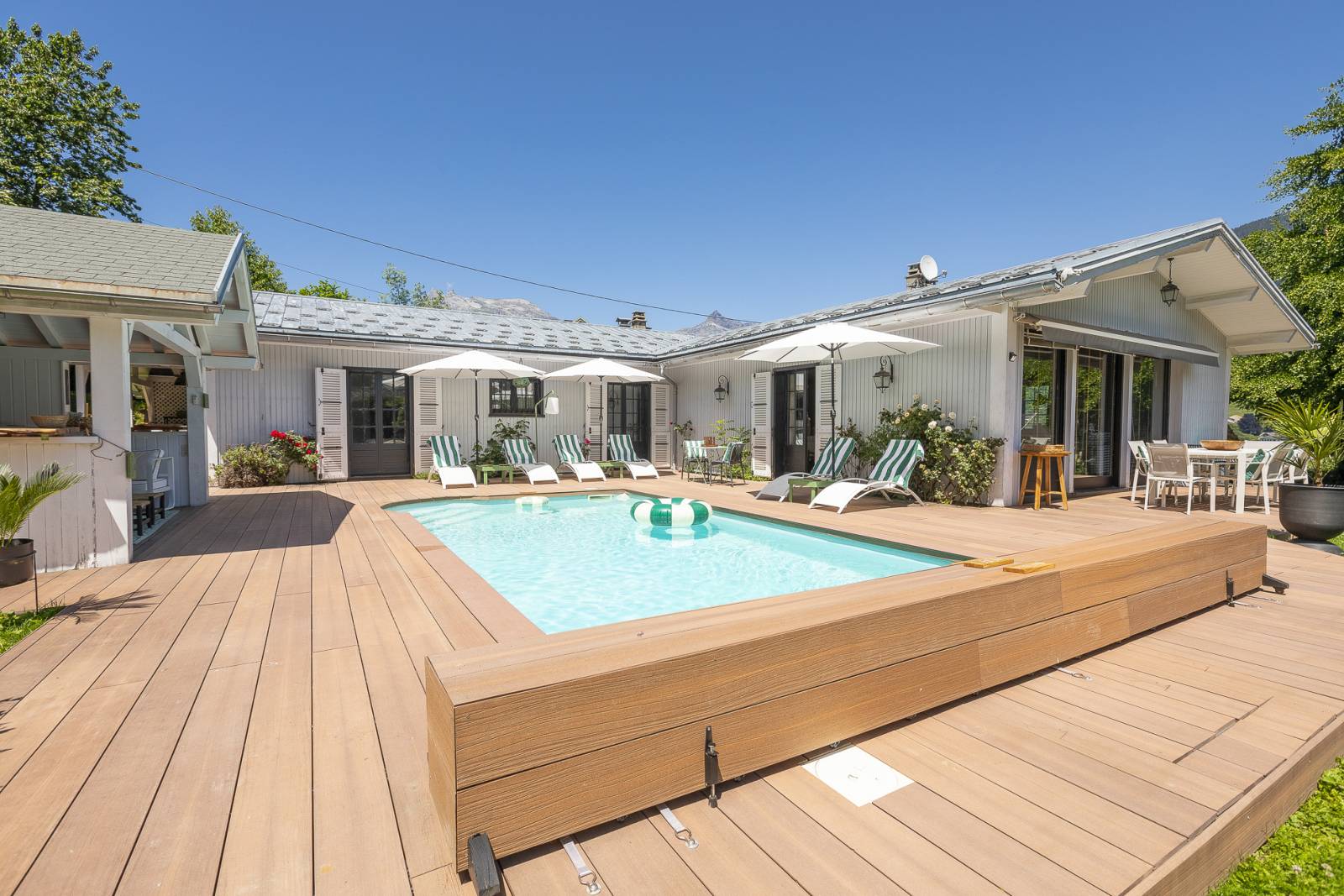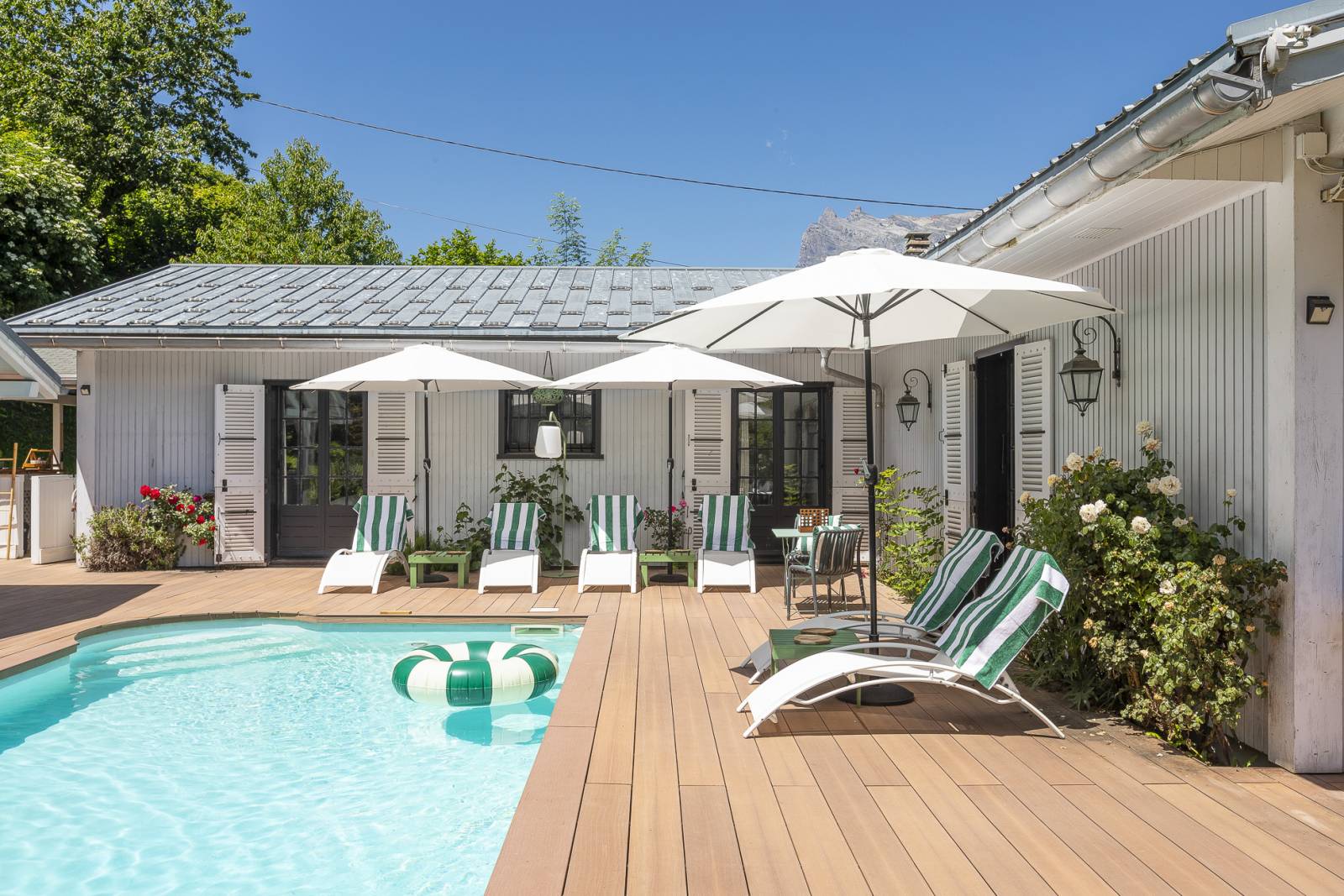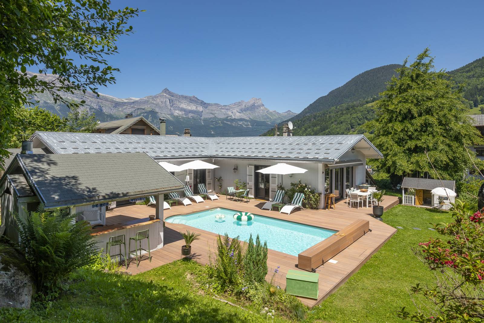 À l’exterieur, sa terrasse avec vue à couper le souffle sur le mont-blanc, son pool house très photogénique et ses jolis recoins seront des espaces parfaits pour des shooting de mobilier de jardin.