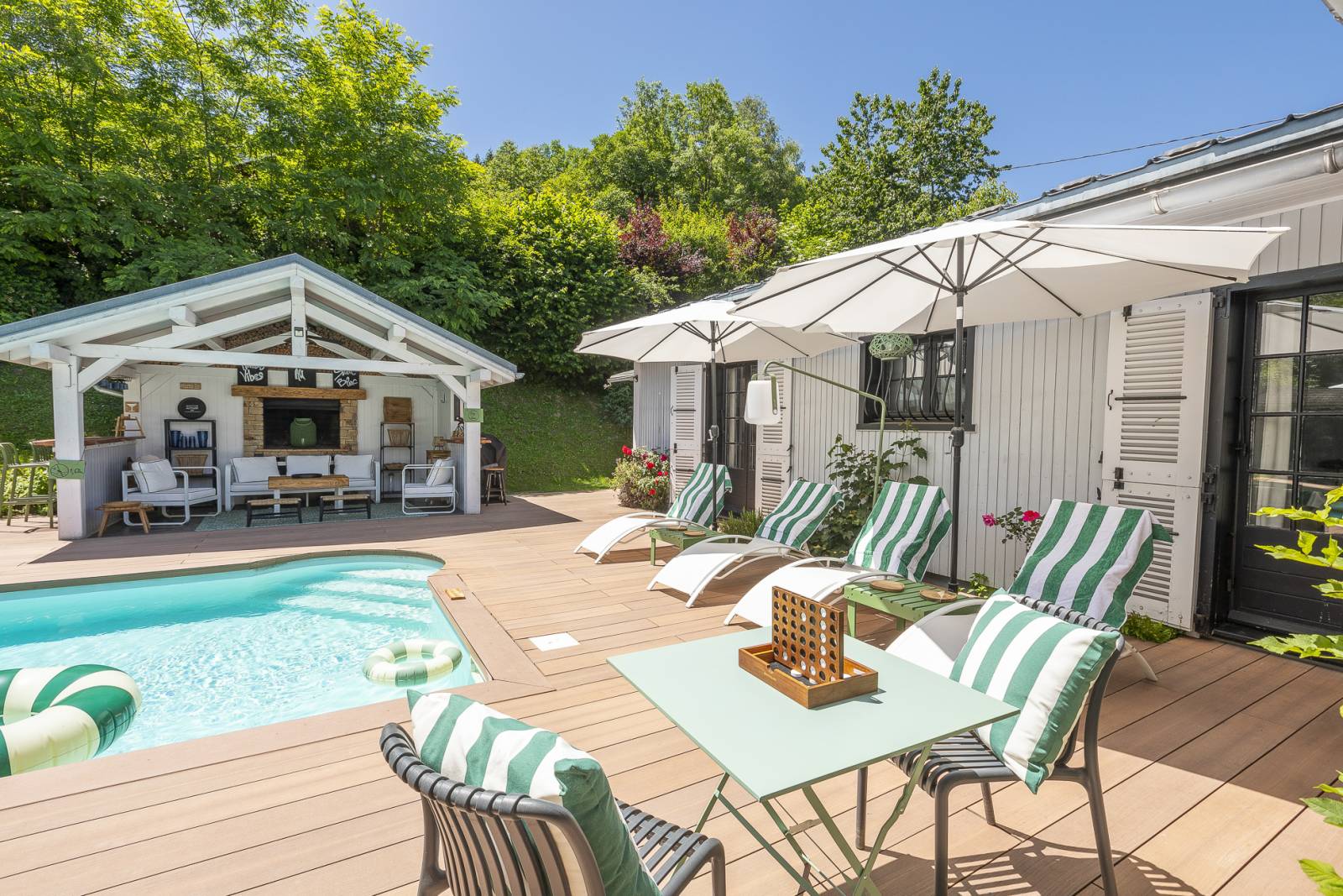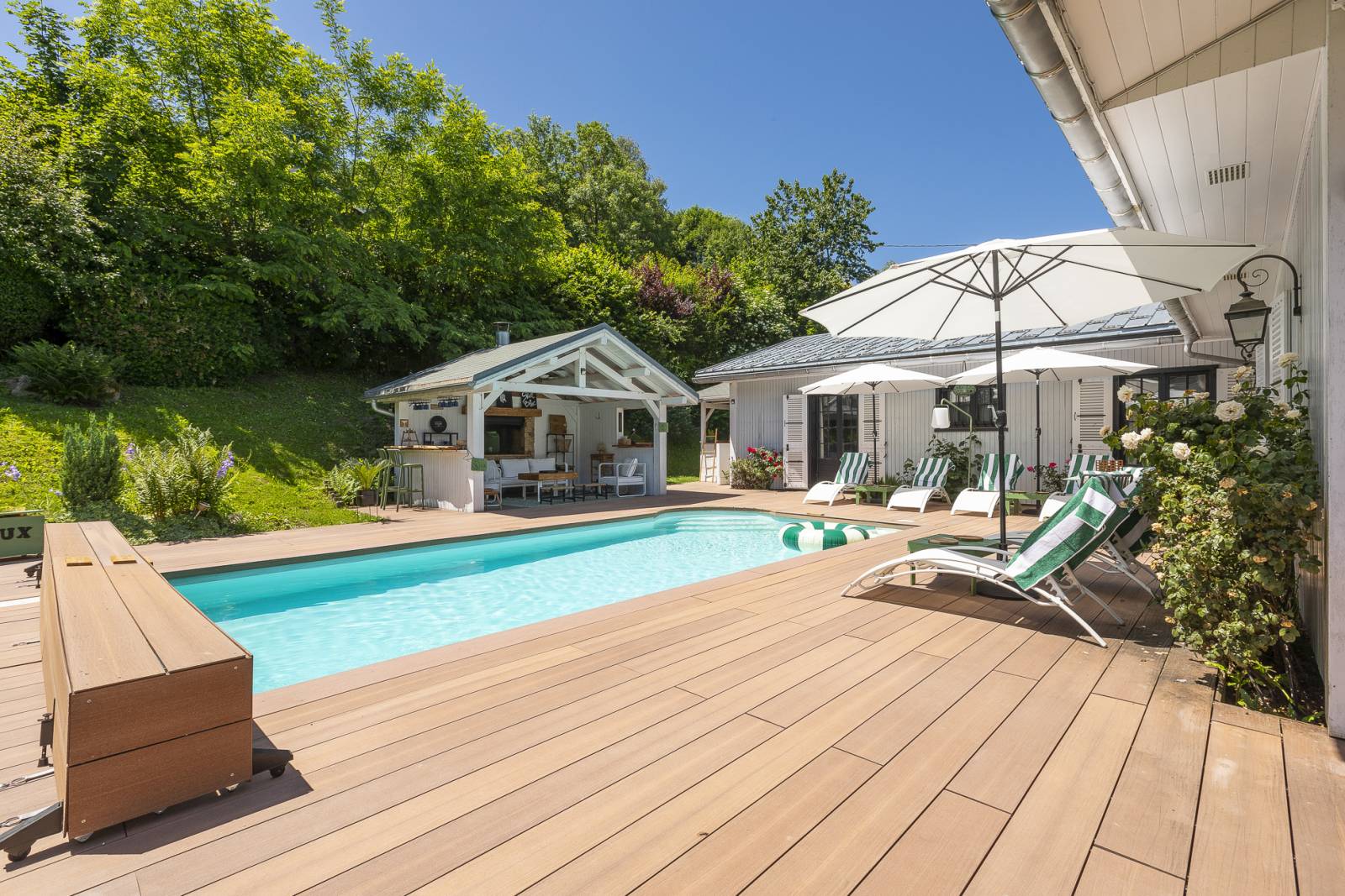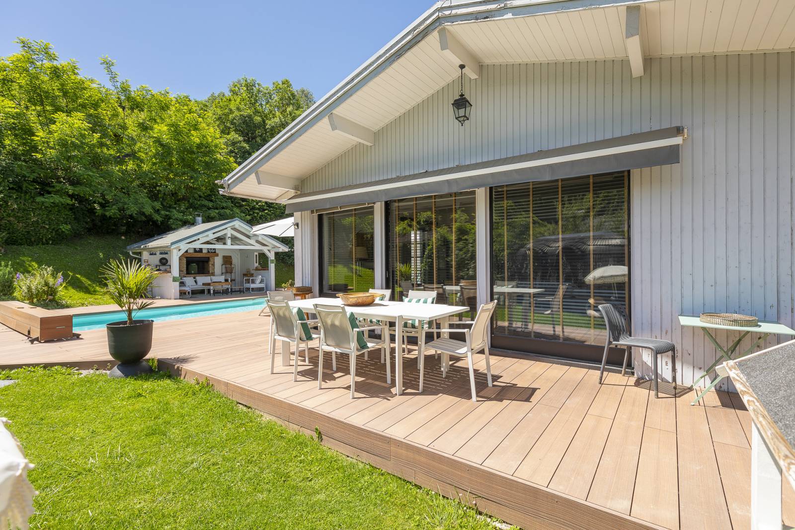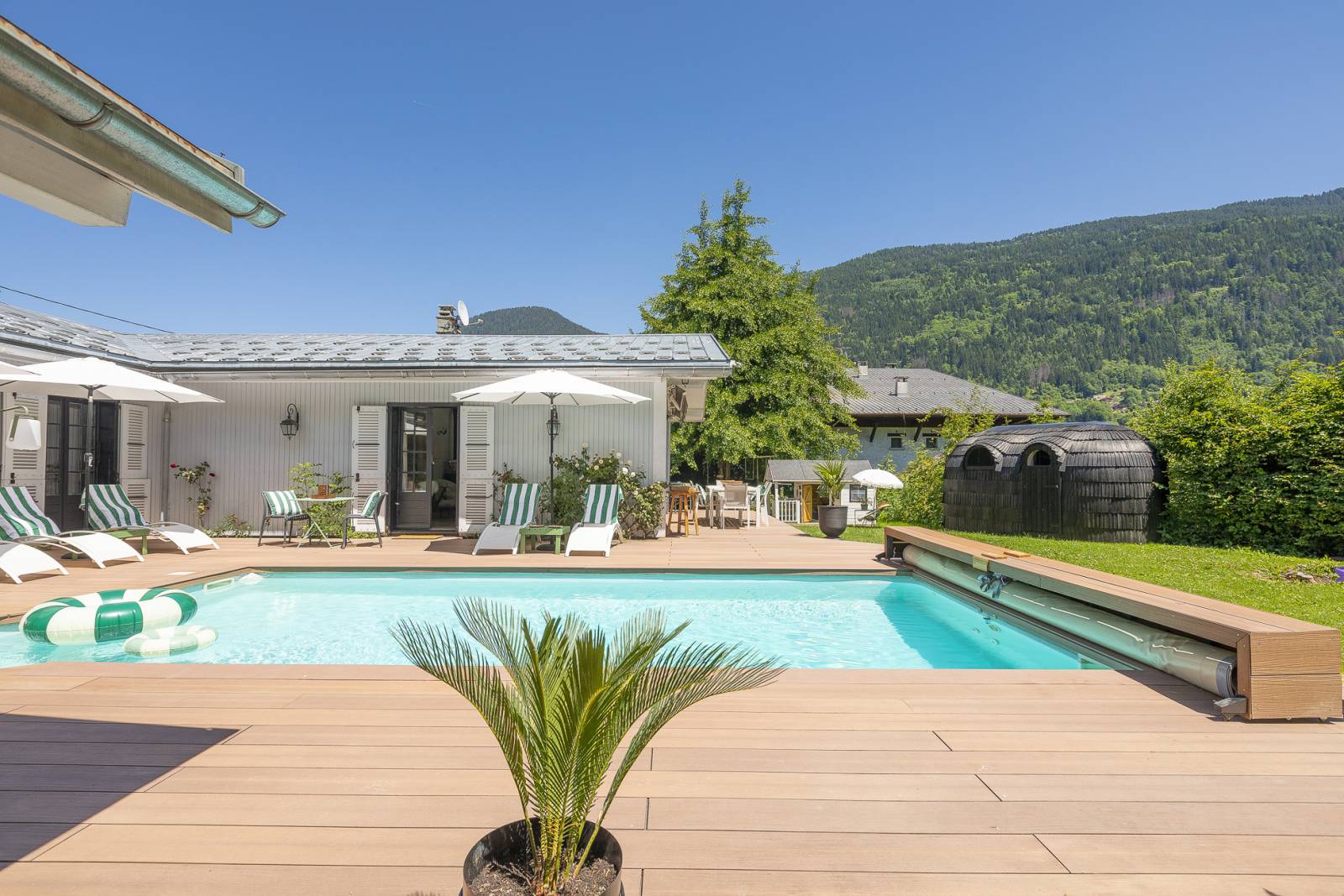À l’exterieur, sa terrasse avec vue à couper le souffle sur le mont-blanc, son pool house très photogénique et ses jolis recoins seront des espaces parfaits pour des shooting de mobilier de jardin.