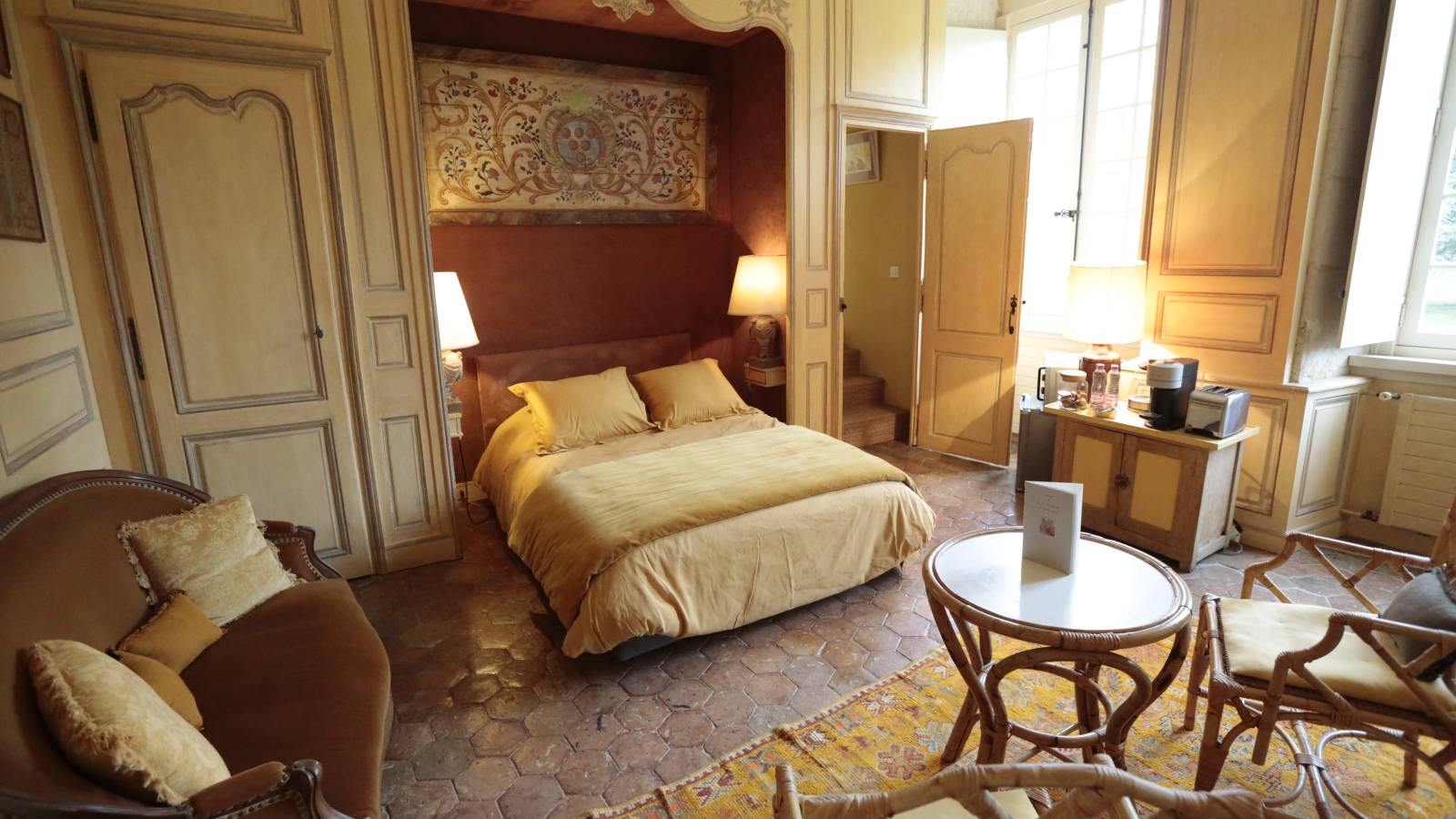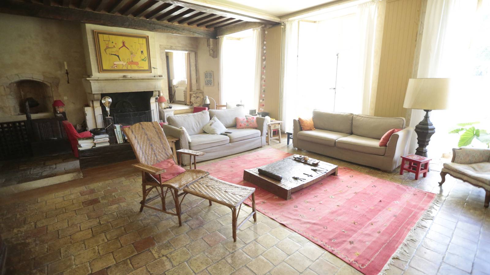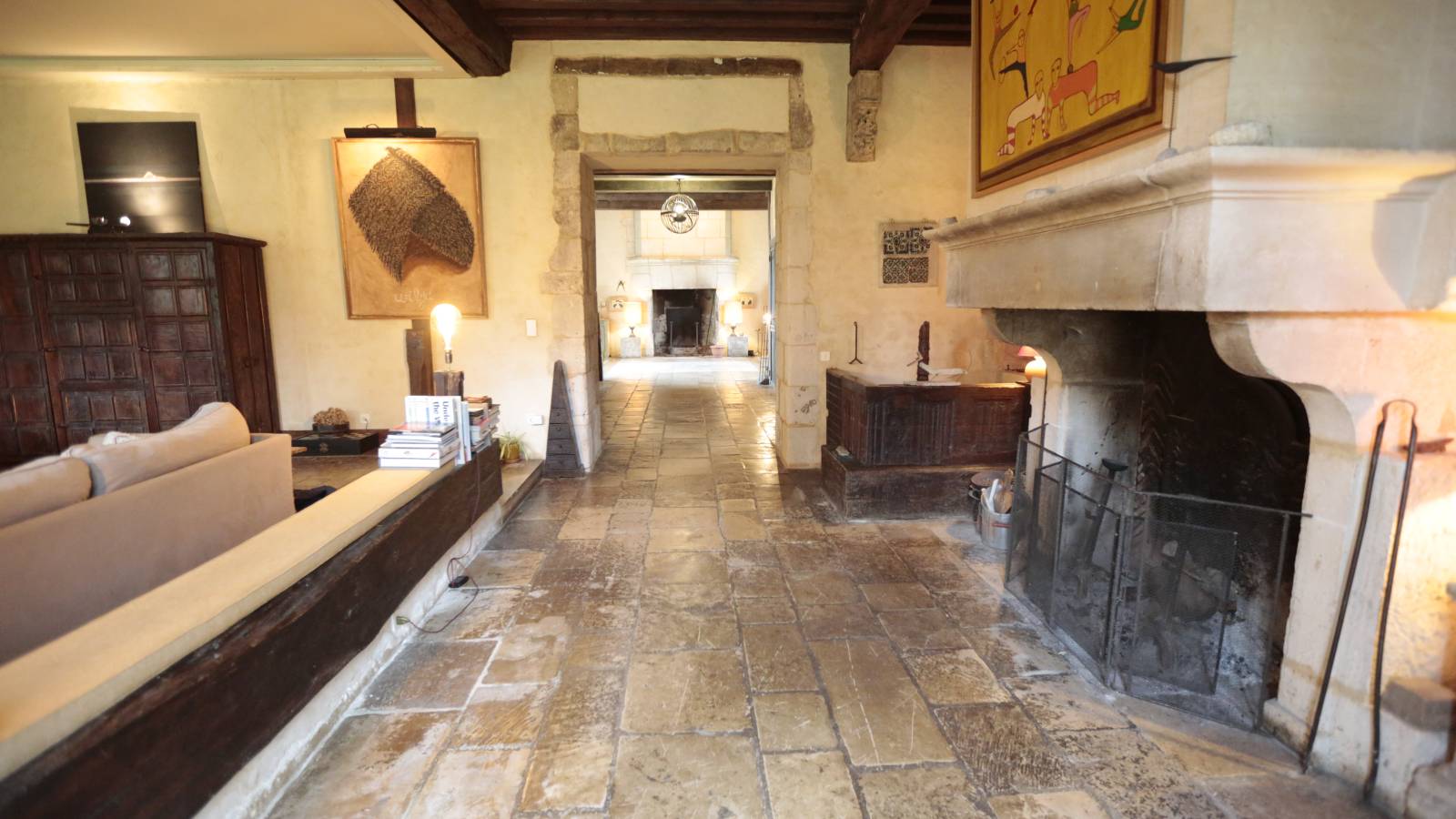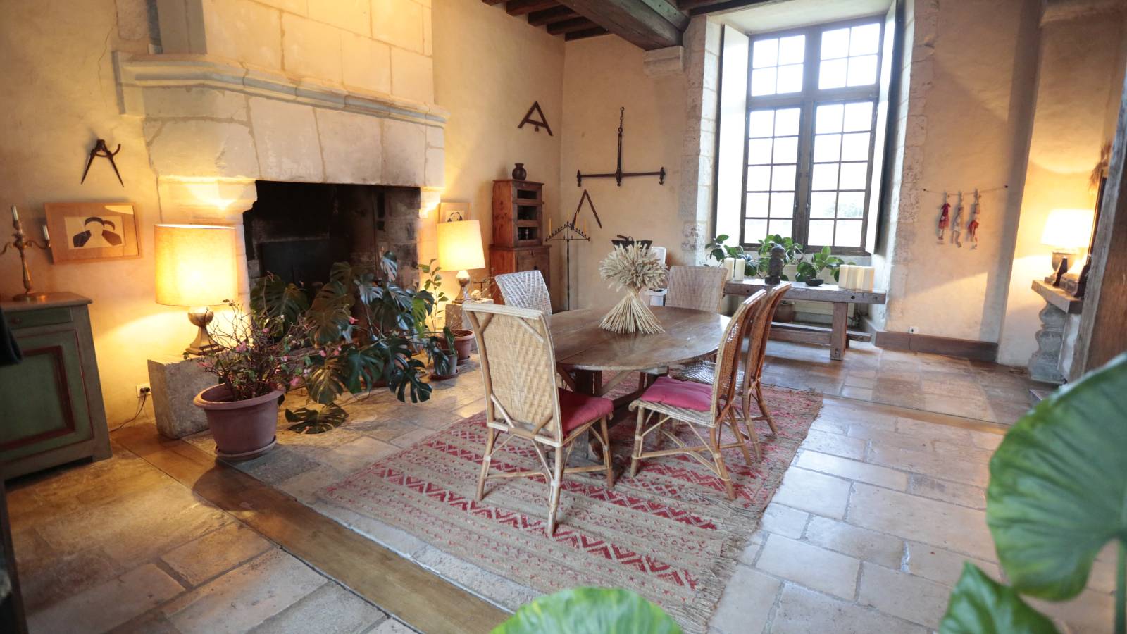 La hauteur sous plafond impressionnante, les moulures d’époque, les cheminées en pierre, les parquets anciens, mais aussi les éléments de décoration choisis avec soin créent une atmosphère chaleureuse et inspirante.