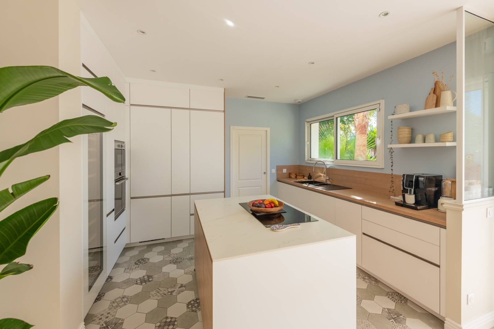 Configuration de la maison : maison sur 2 niveaux, séjour de 60m2, 4 salles de bain, 5 chambres de 13,5m2, hauteur sous plafond 2m70, bureau de 10m2, stockage de 25m2, poolhouse de 25m2