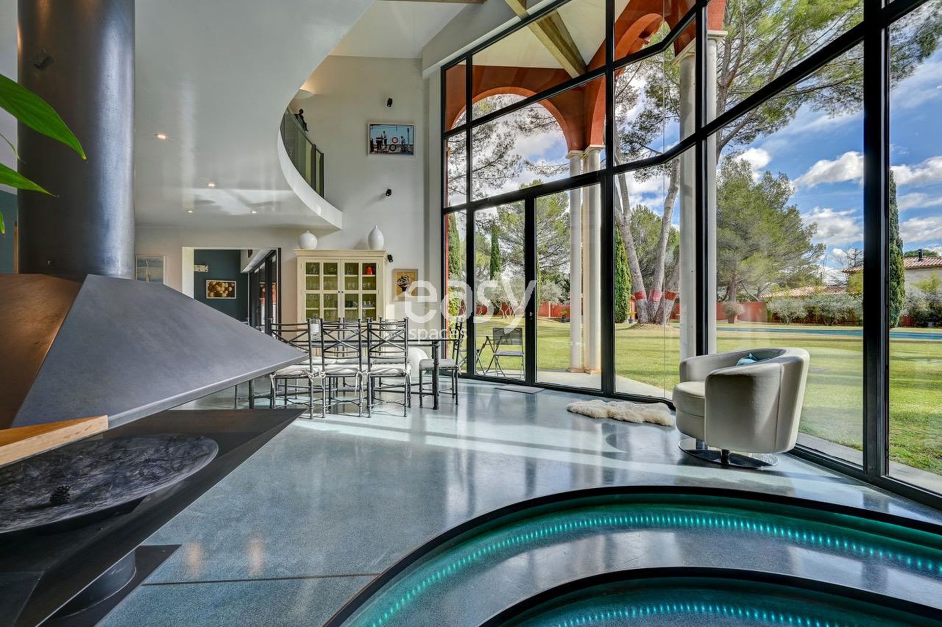 cette villa atypique dispose d’un salon très lumineux avec grande baies vitrées et séjour cathédrale ouvert sur les exterieurs.