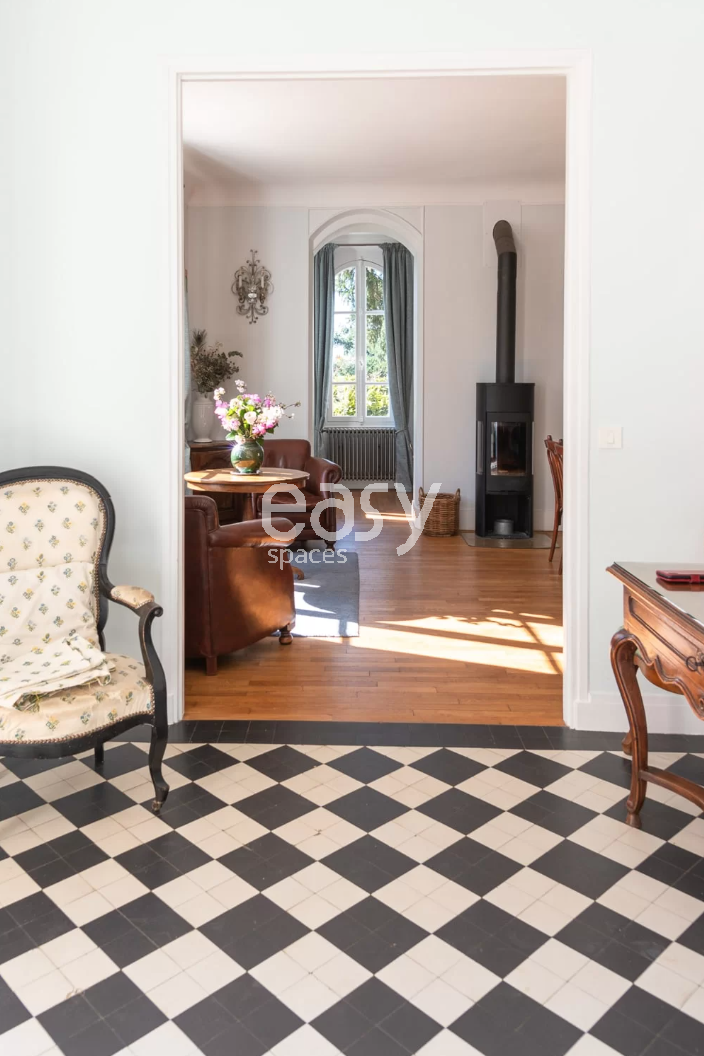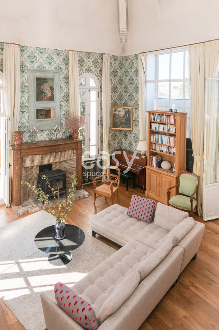 Cette jolie maison en location pour shooting allie parfaitement l'aspect esthétique classique au côté épuré et raffiné. Son séjour lumineux avec tapisserie, poêle à bois et décoration cosy permet comme le reste de la villa de multiples ambiances pour vos prises de vues photos.