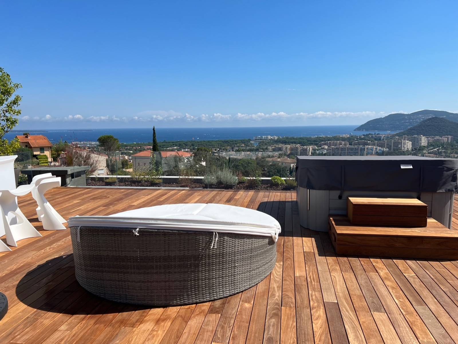 La terrasse, véritable prolongement du salon, bénéficie d’une vue mer panoramique à couper le souffle. Elle sera idéale pour un shooting de mobilier de jardin par exemple.