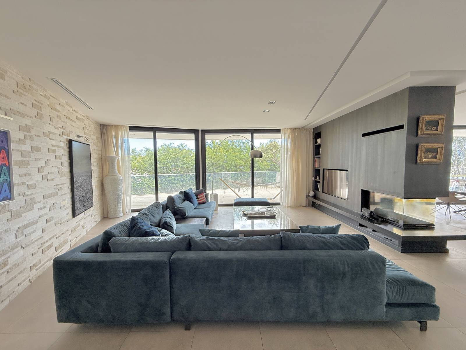Le séjour principal, spacieux et baigné de lumière, est décoré dans un style résolument contemporain, mêlant mobilier design, teintes naturelles et touches de modernité.