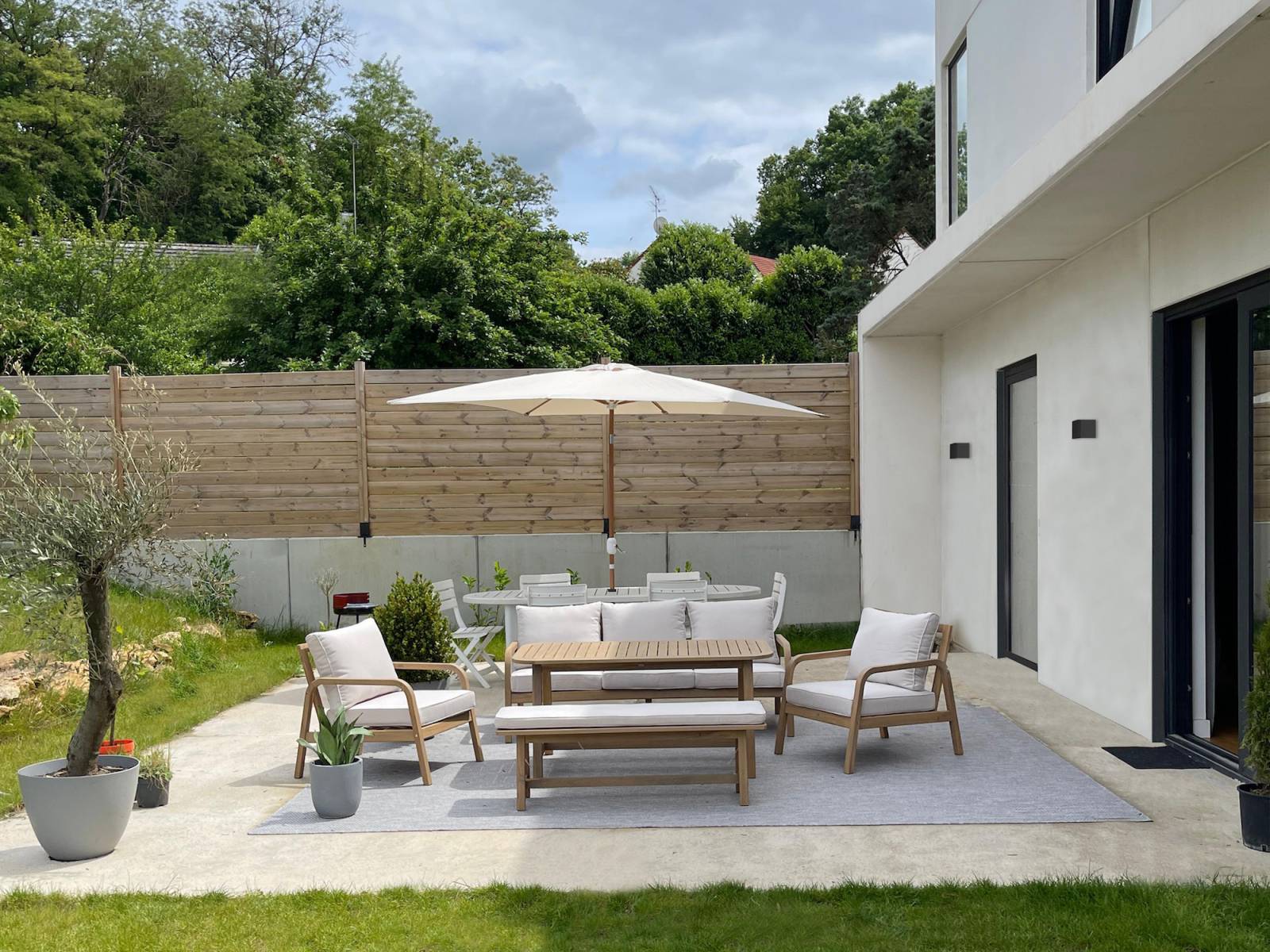 Le jardin plat de 500 m², soigneusement entretenu, complète parfaitement ce décor moderne.
