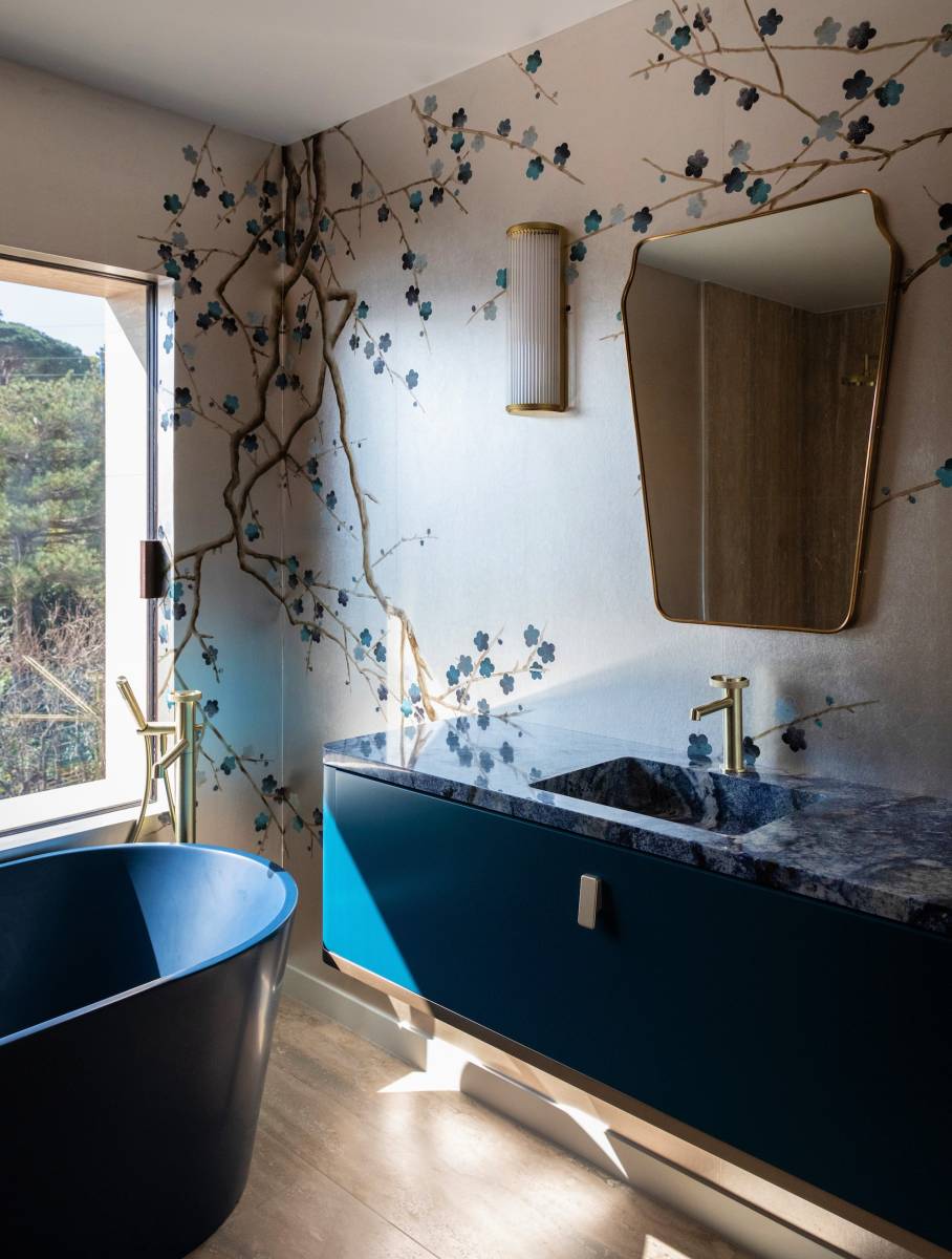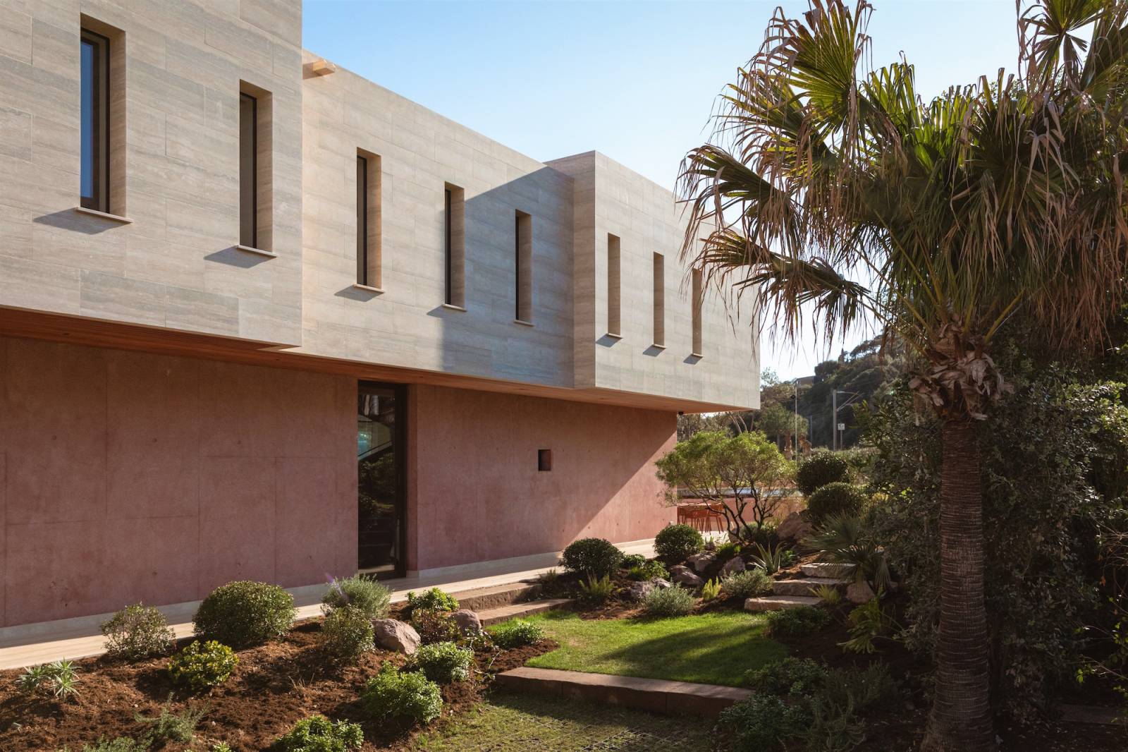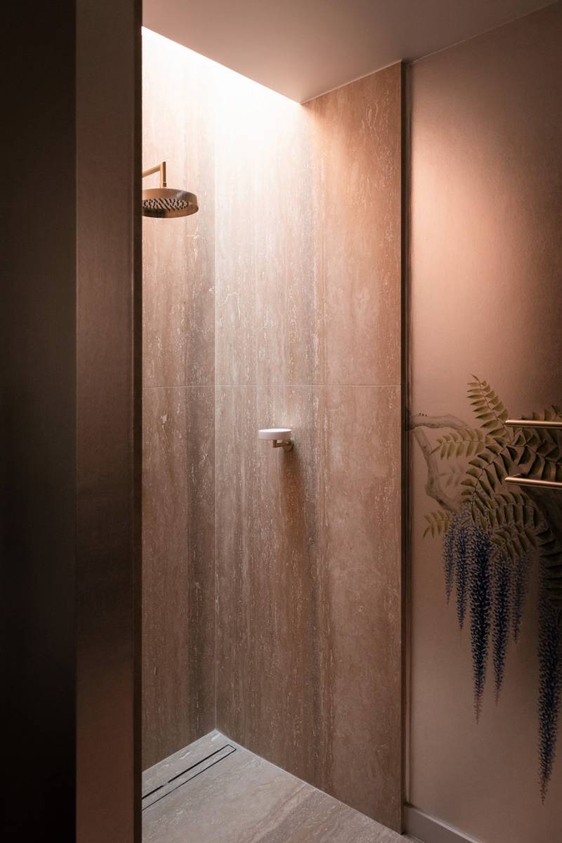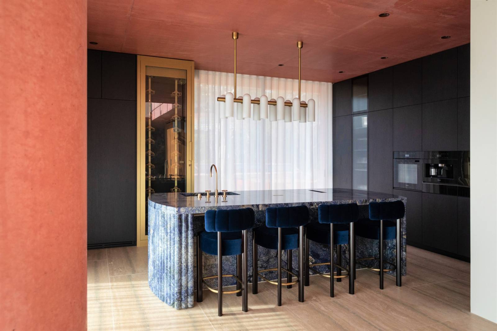 La décoration intérieure, chic et moderne, allie confort et élégance. Le mobilier haut de gamme, aux lignes épurées, se marie harmonieusement avec les teintes terracotta des murs créant ainsi une atmosphère chaleureuse et originale.