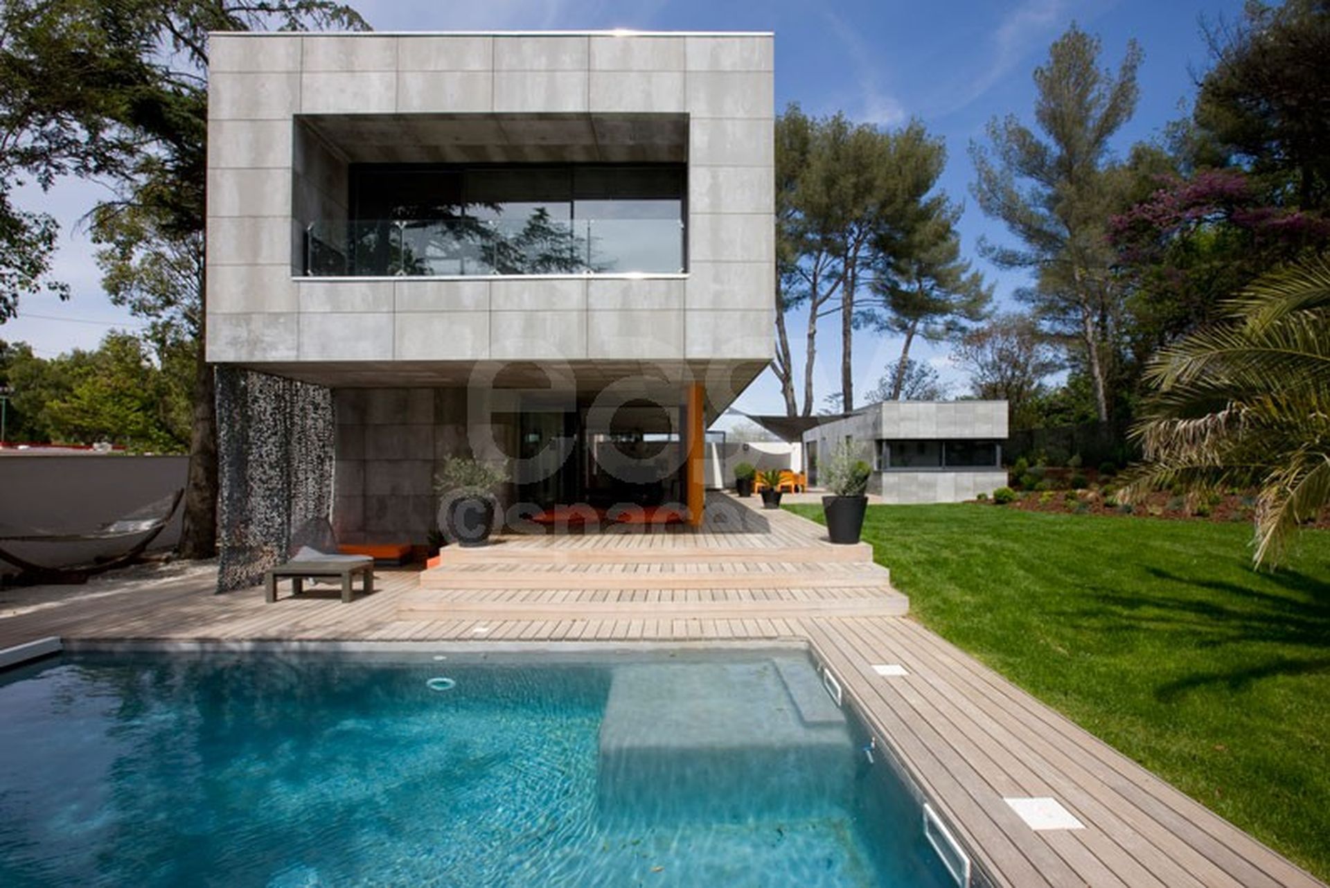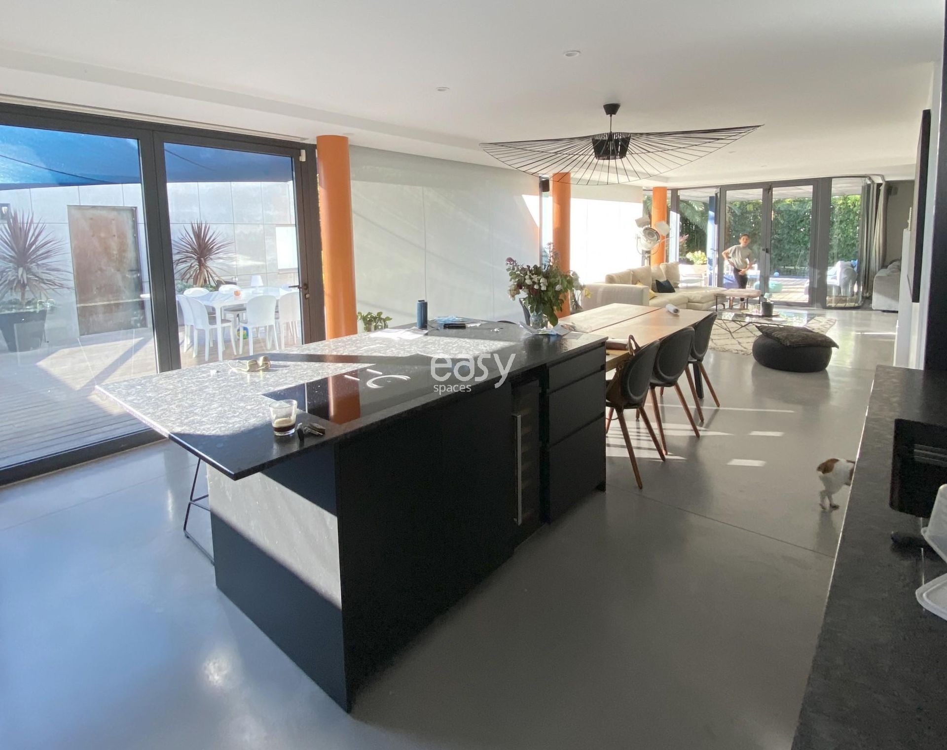 Le grand espace séjour lumineux de près de 100m2, sa décoration moderne, la piscine chauffée, et le pool house offrent un cadre sophistiqué et adaptable à toute sorte d'activité artistique et événementielle.