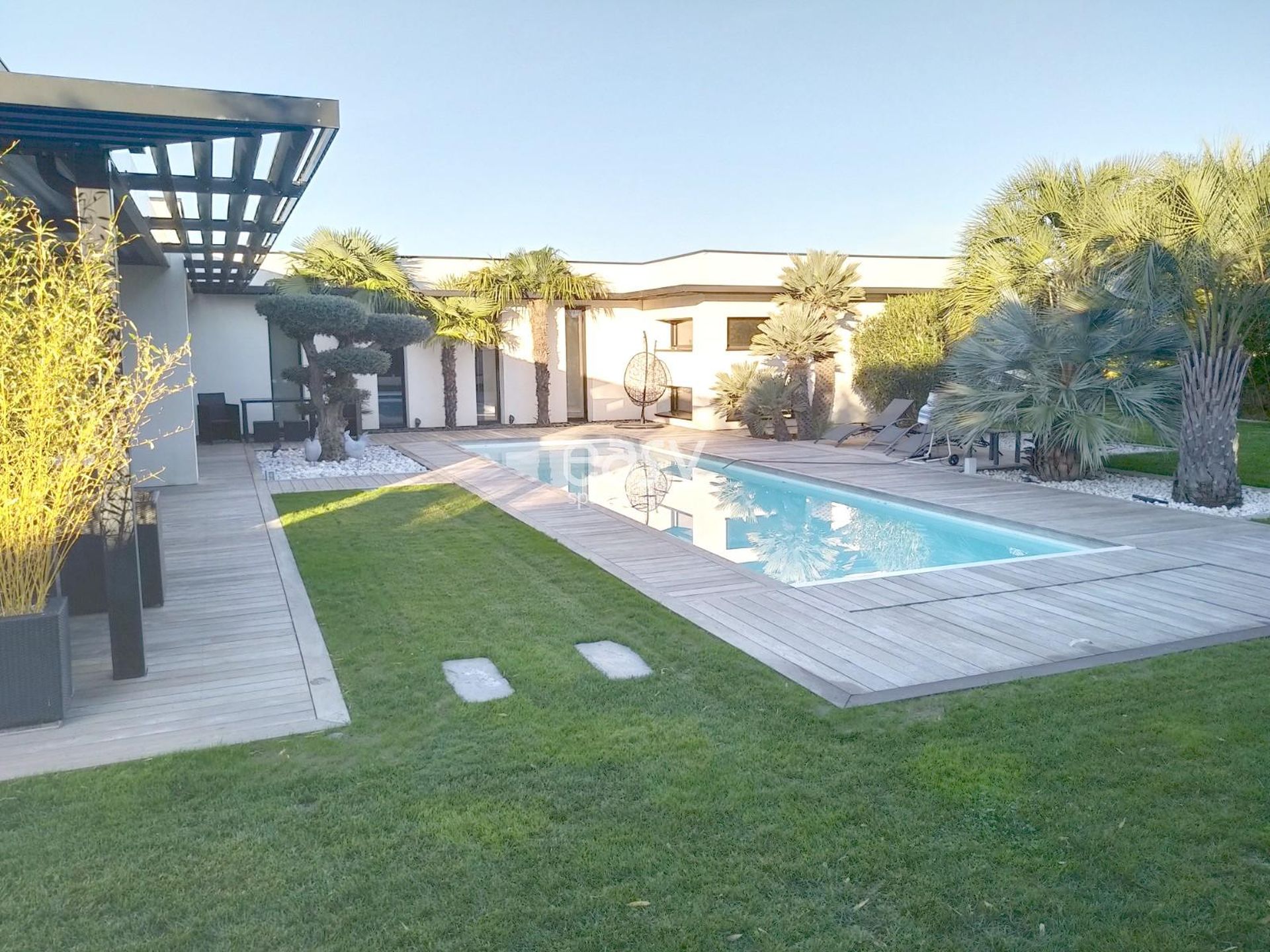 Le jardin plat avec piscine chauffée et terrasse seront parfaits pour un tournage de court métrage ou pour pour des photos de mobilier de jardin par exemple.