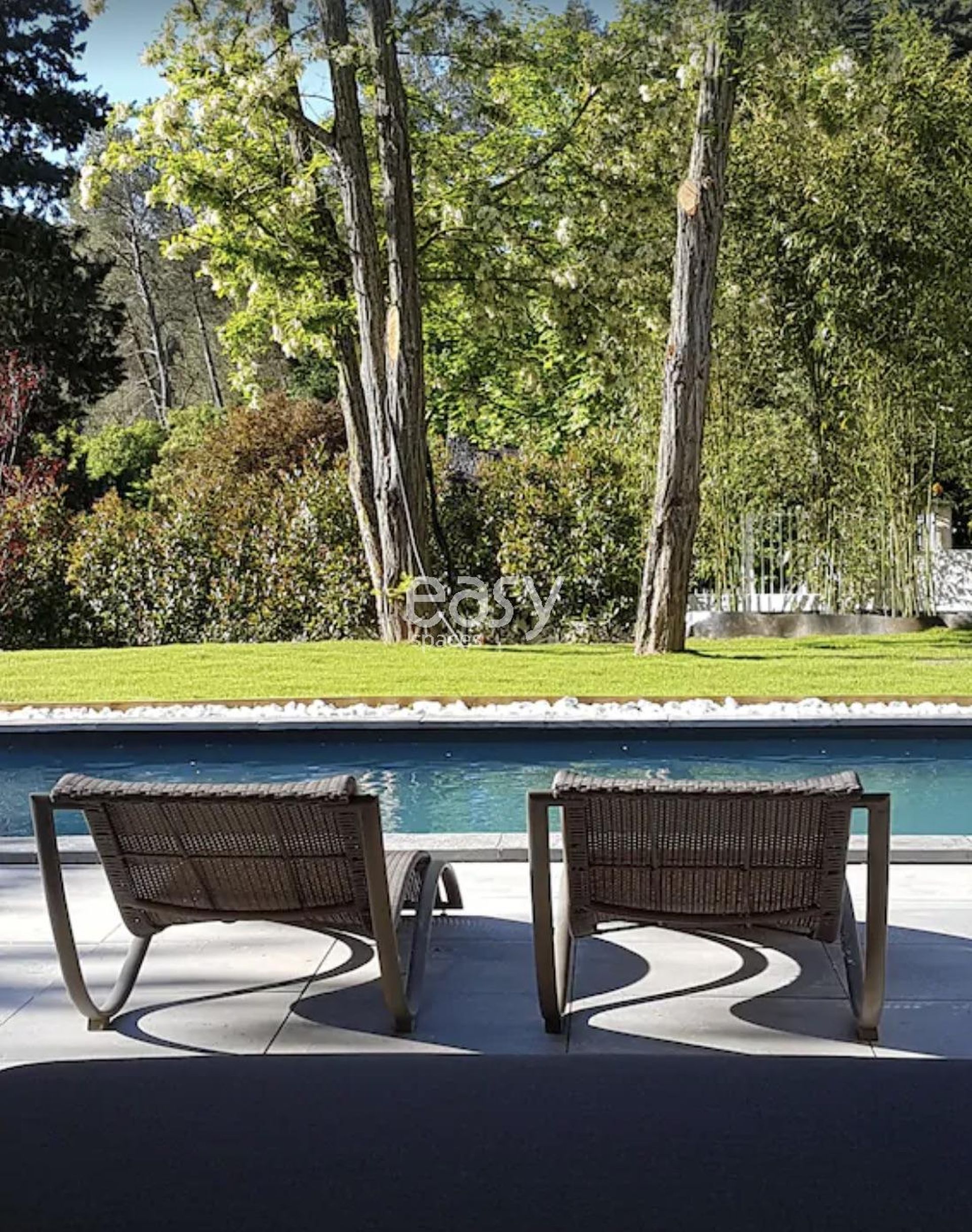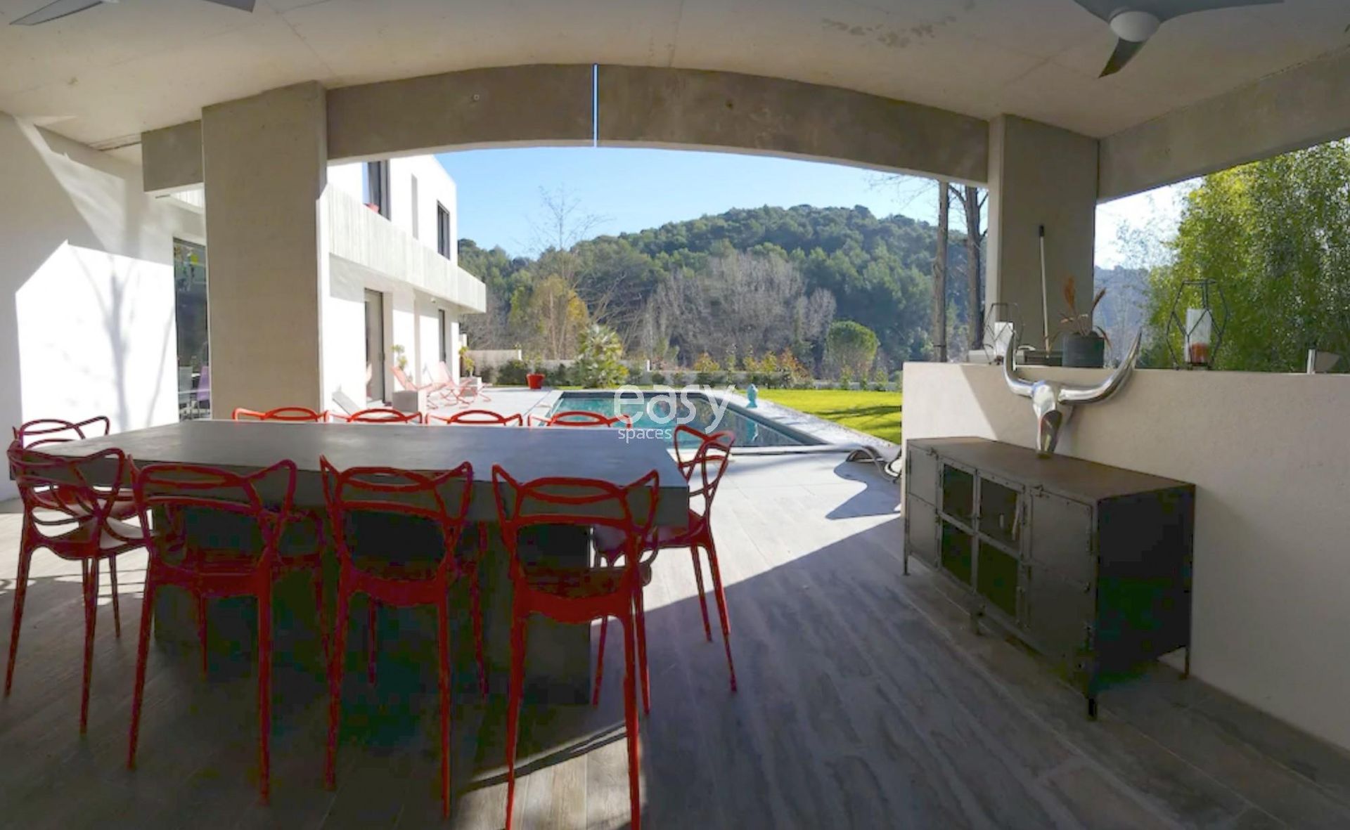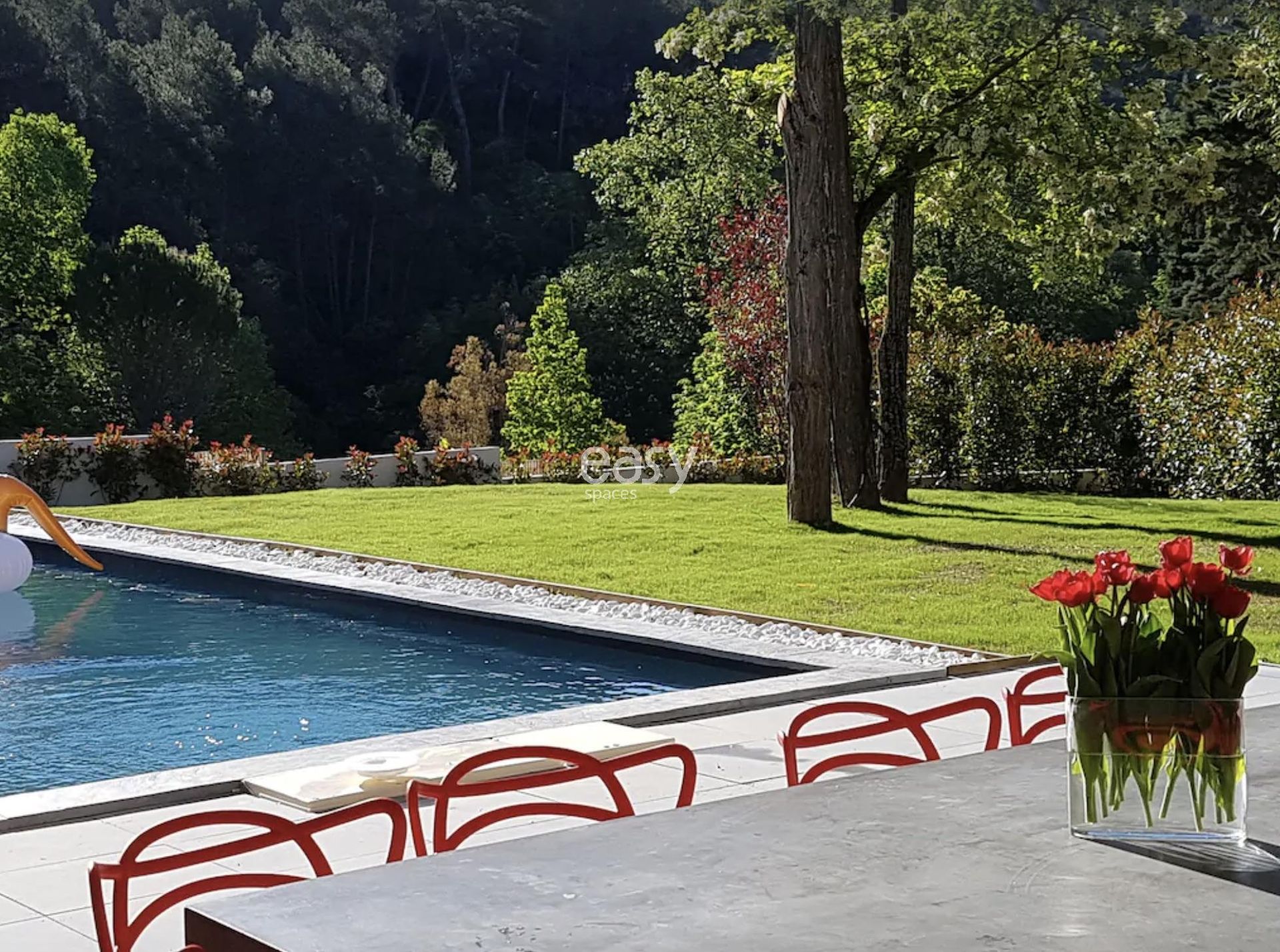 Bénéficiant d'un bel espace séjour lumineux de 100m2 vue piscine avec décoration moderne et d'un jardin plat de 2000m2, ce décor sera idéal pour un shooting de mobilier de jardin par exemple.