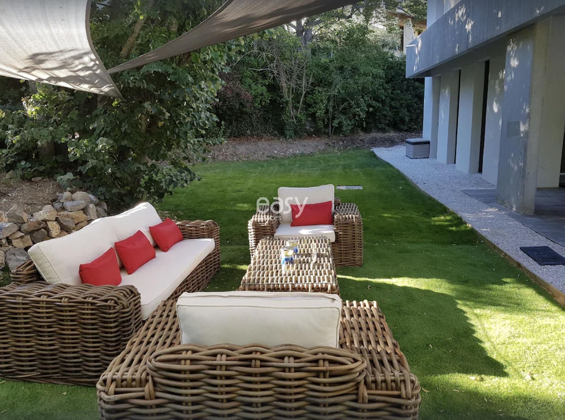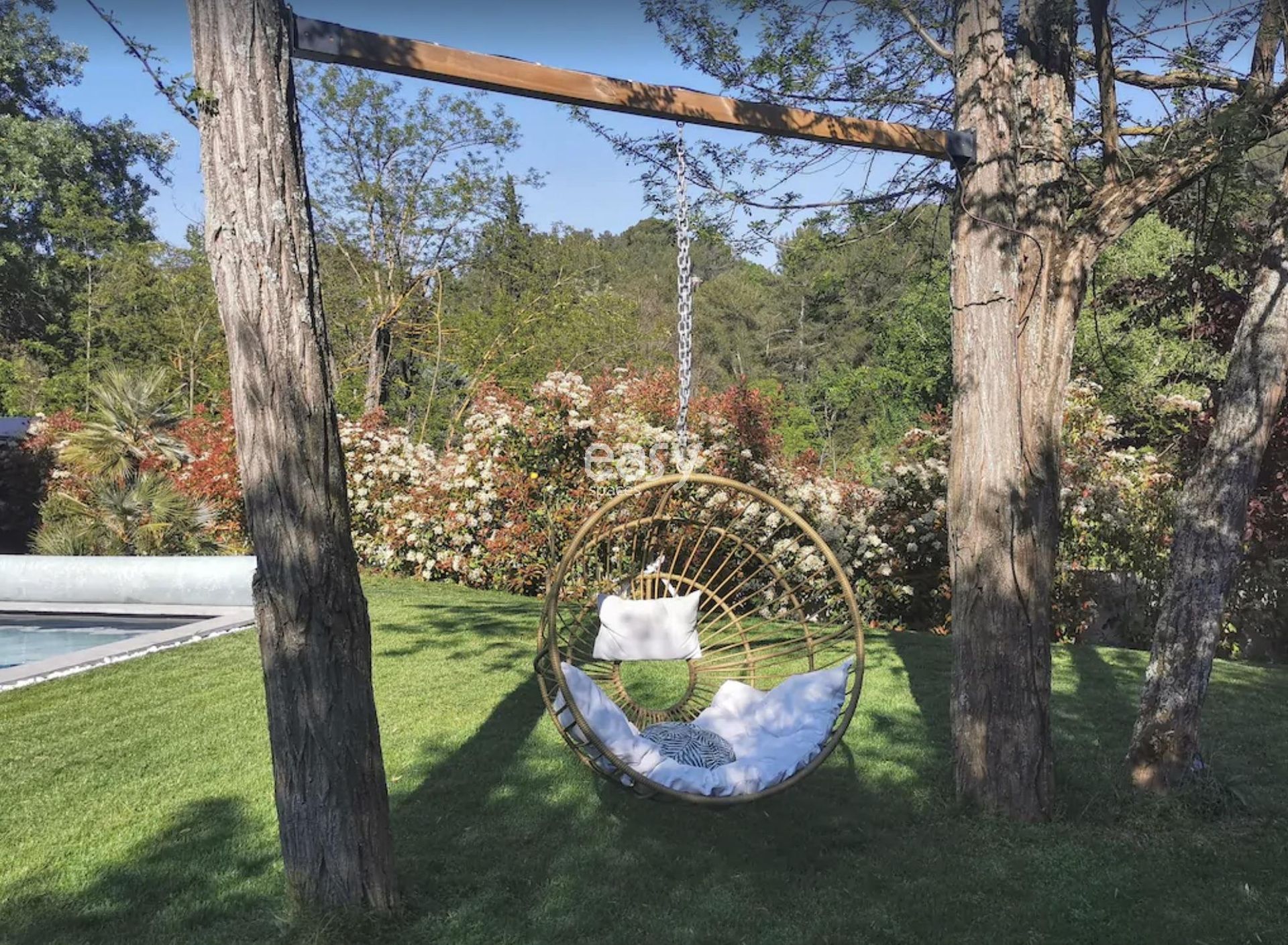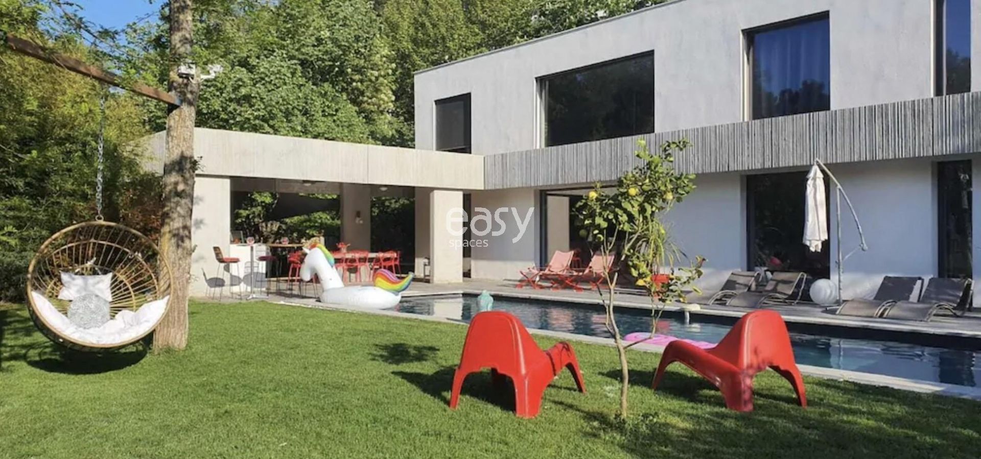 Bénéficiant d'un bel espace séjour lumineux de 100m2 vue piscine avec décoration moderne et d'un jardin plat de 2000m2, ce décor sera idéal pour un shooting de mobilier de jardin par exemple.