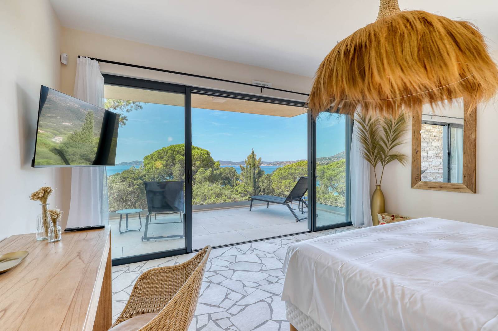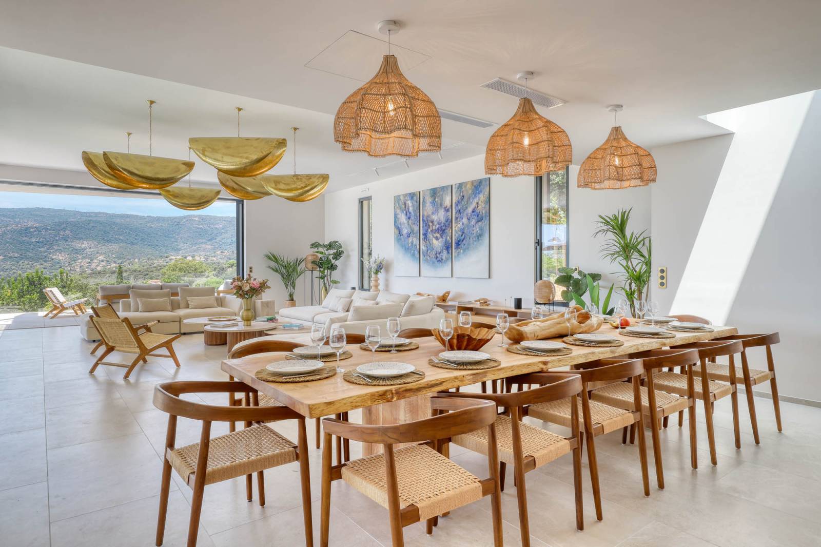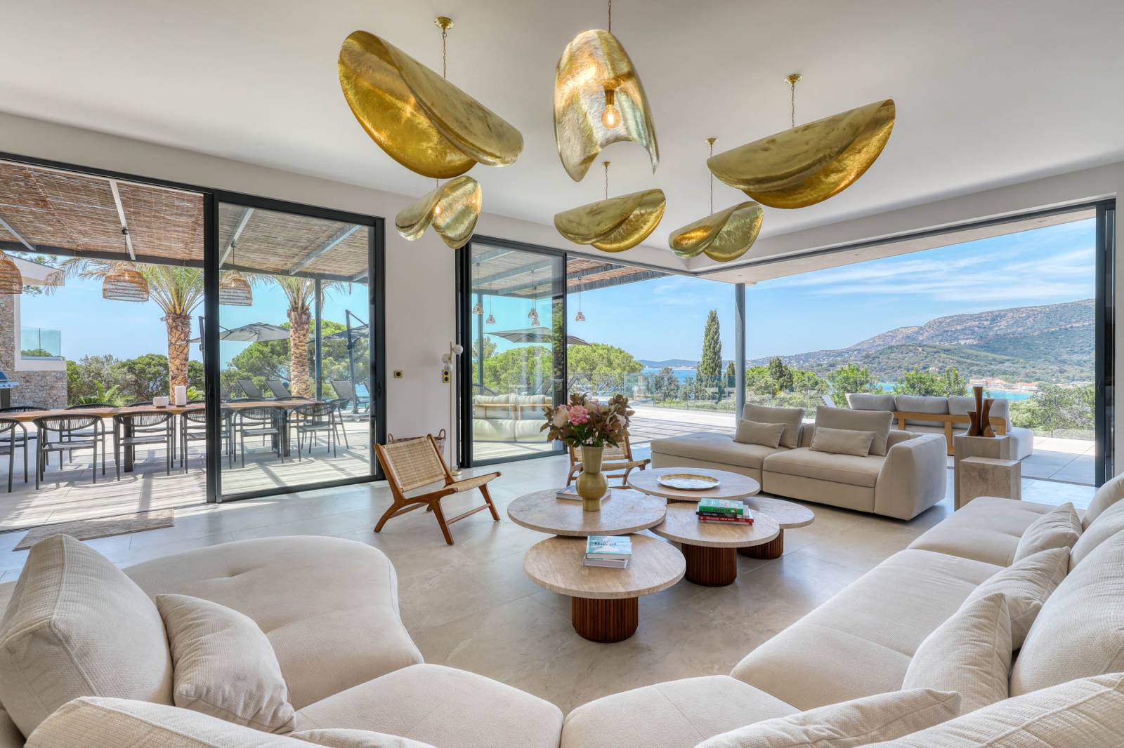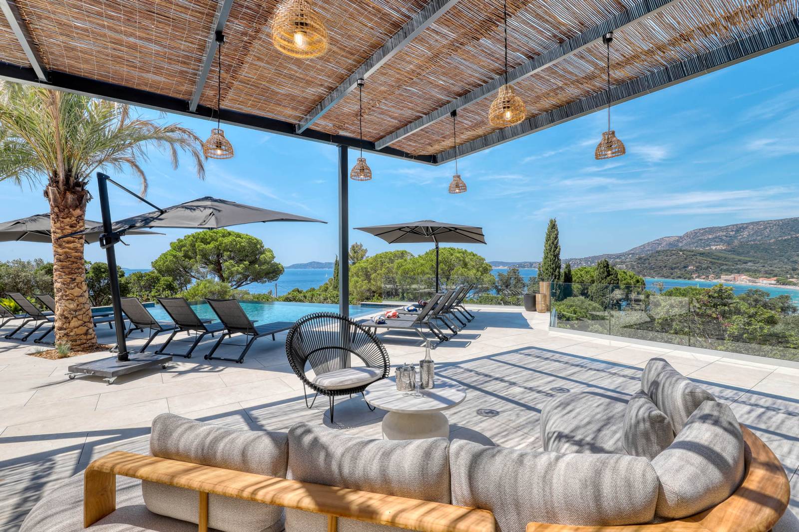Dès l’entrée, la vue panoramique sur la Méditerranée capte l’attention. Le séjour spacieux, entièrement ouvert sur l’extérieur grâce à ses vastes baies vitrées, profite d'une belle lumière naturelle toute la journée. Les tons clairs et la décoration épurée accentuent cette sensation d’espace et de pureté très photognénique.