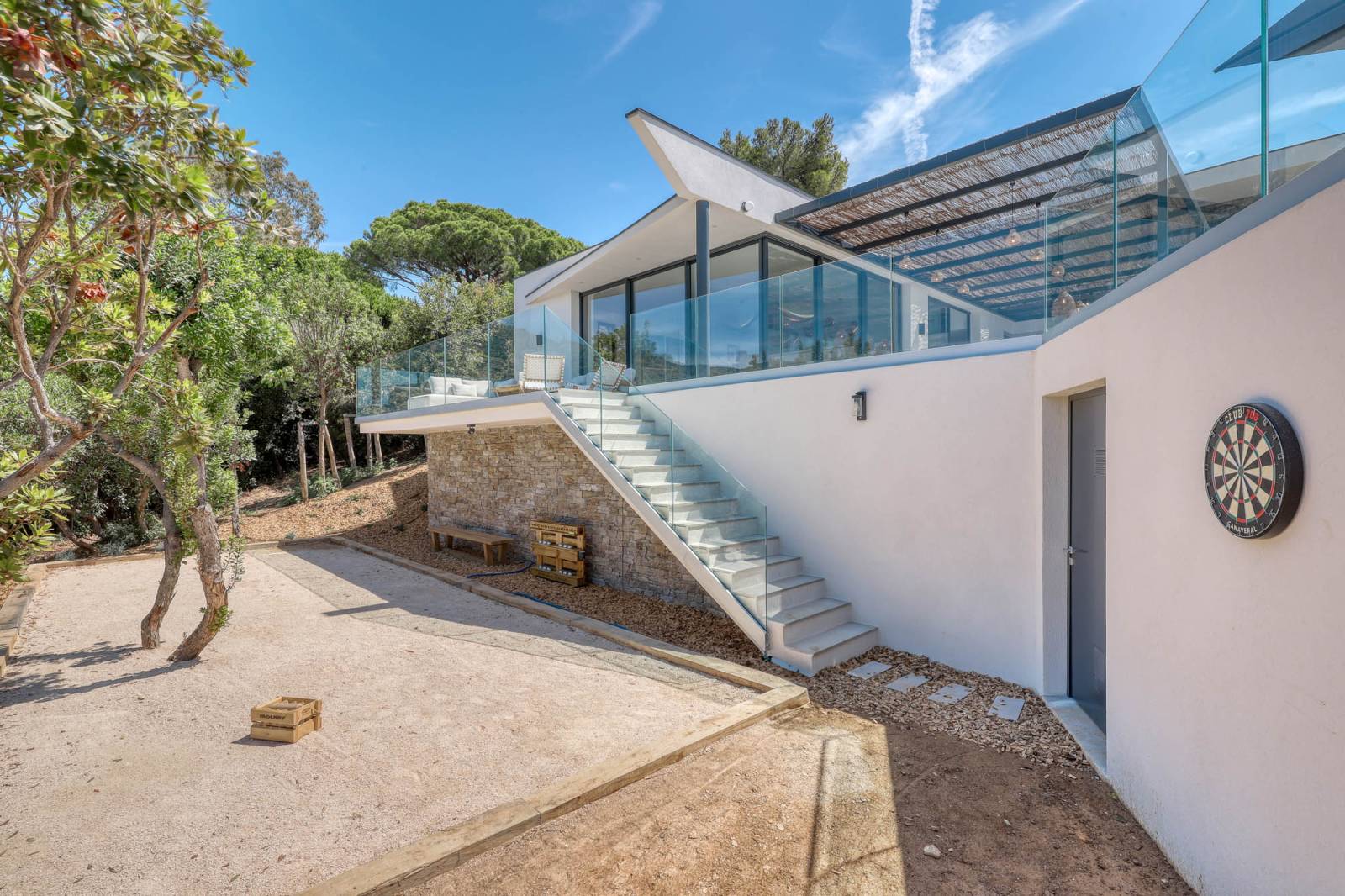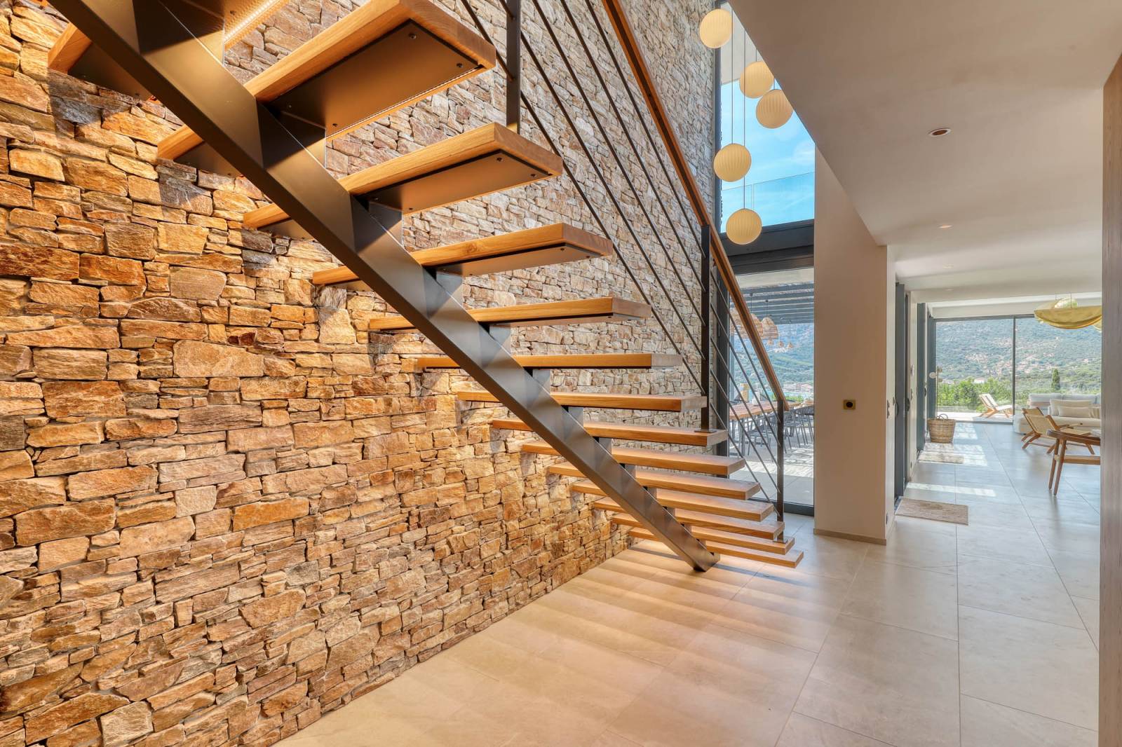 Nichée sur les hauteurs du Lavandou, à proximité de Saint-Tropez, cette villa contemporaine en pierre naturelle offre un décor exceptionnel, entre luxe, lumière et nature.