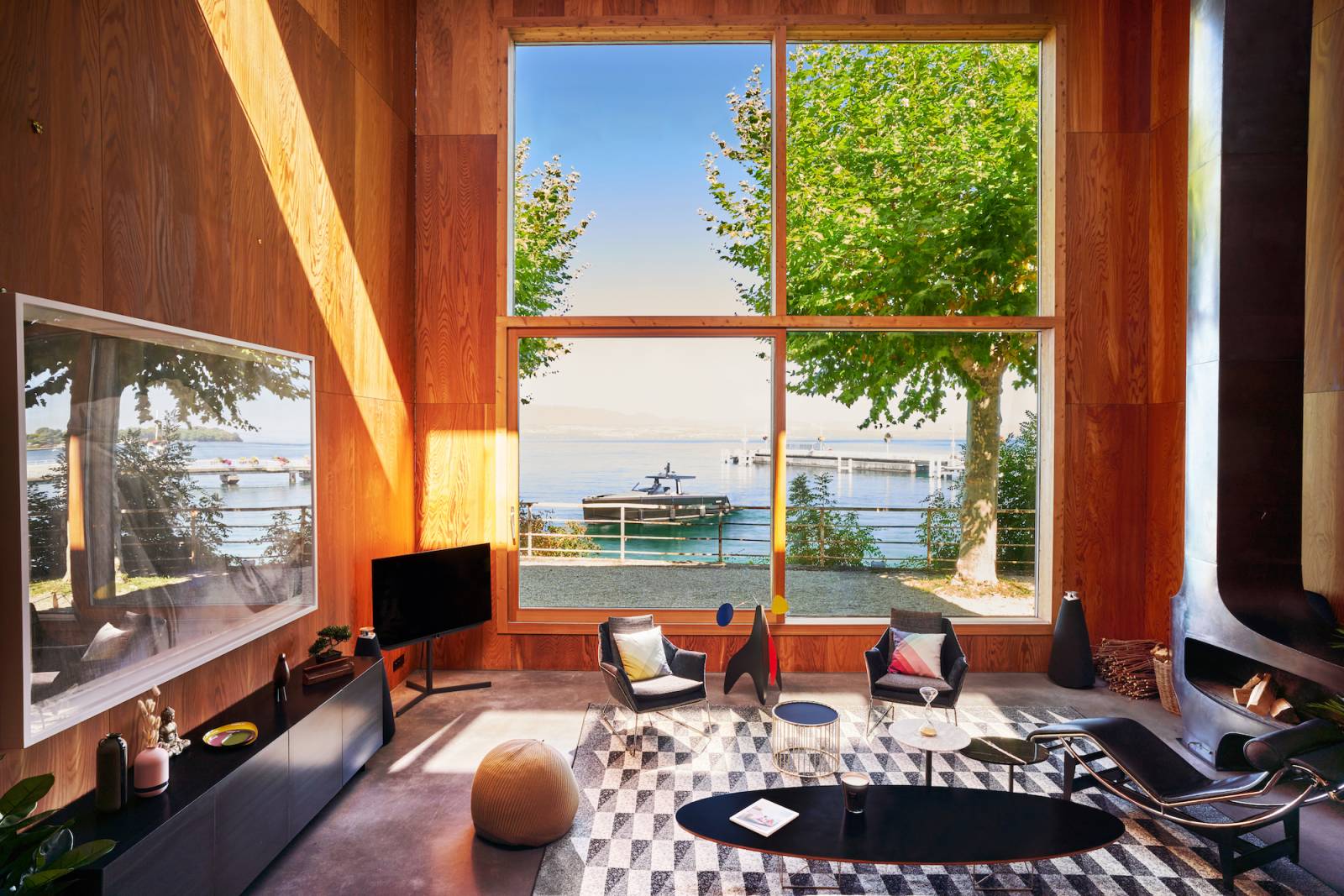 Le salon avec cheminée offre un panorama spectaculaire sur le lac, idéal pour des plans larges, des scènes lifestyle ou des shootings d’ambiance.