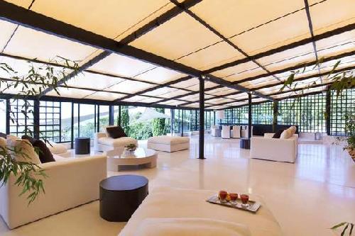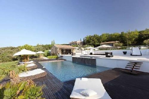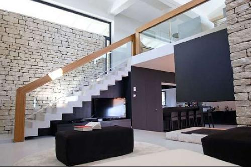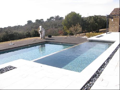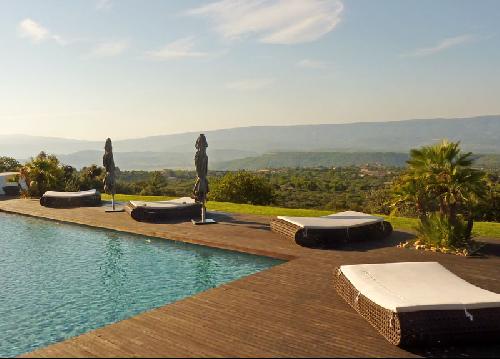 Une belle maison à louer avec piscine, et vue panoramique sur les montagnes du Lubéron près de Gordes et Roussillon dans le sud de la France. Une villa d ' exception avec des volumes extraordinaires. Jugez plutôt: séjour 200 m2, terrasses piscine 400m2. La propriété est entourée de bassins qui se déversent les uns dans les autres. Décoration moderne aussi à l ' intérieur, avec un mélange de pierre/chame qui se marie très bien avec les touches contemporaines. Un très beau lieu de tournage, ou pour des productions photos dans le Lubéron, en Provence Alpes Côte d ' Azur.