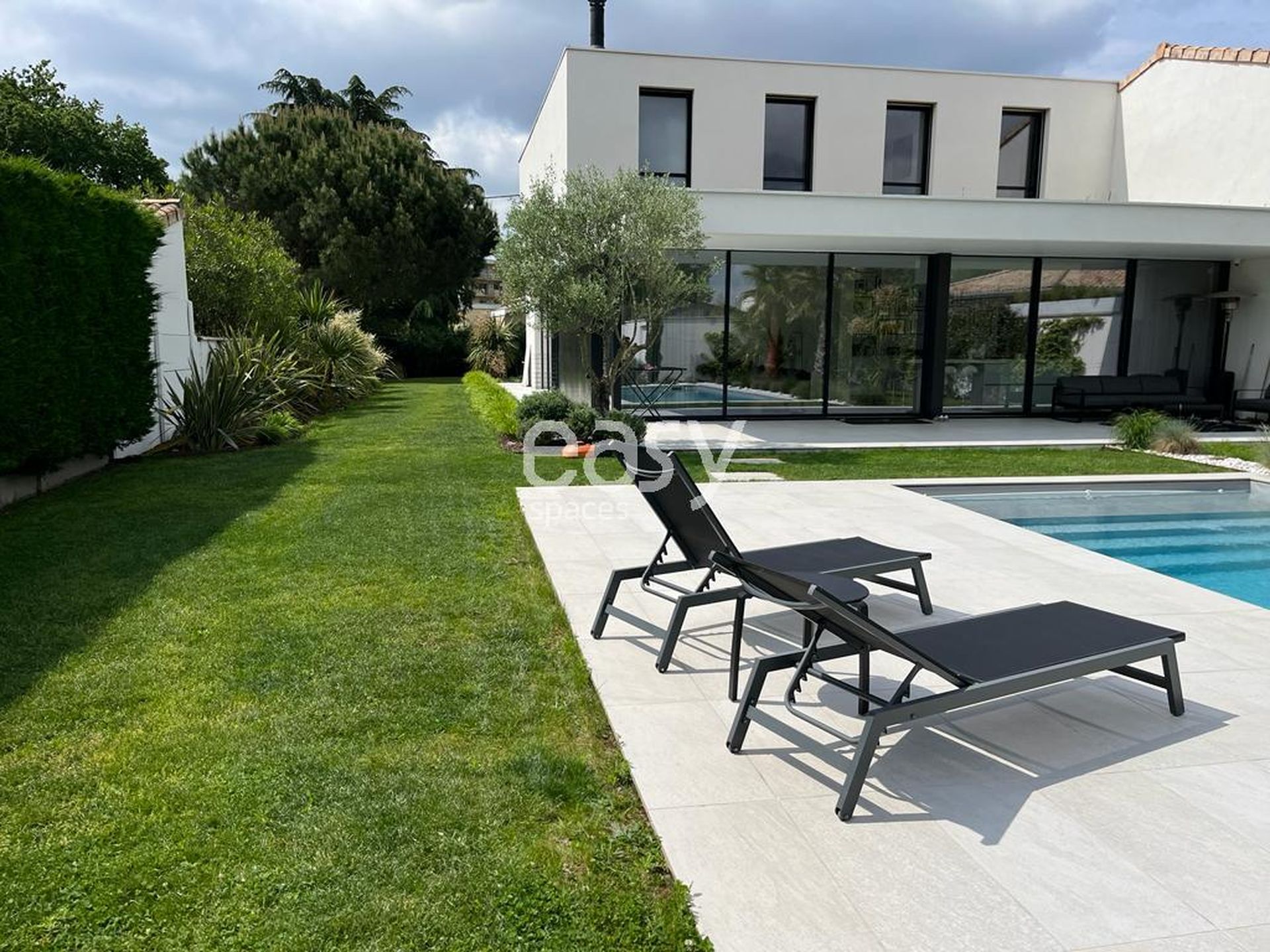Bénéficiant d'un bel espace séjour lumineux de 90m2 vue piscine avec décoration épurée et d'un jardin de 800m2, ce décor incroyable sera idéal pour un shooting de mobilier de jardin par exemple.
