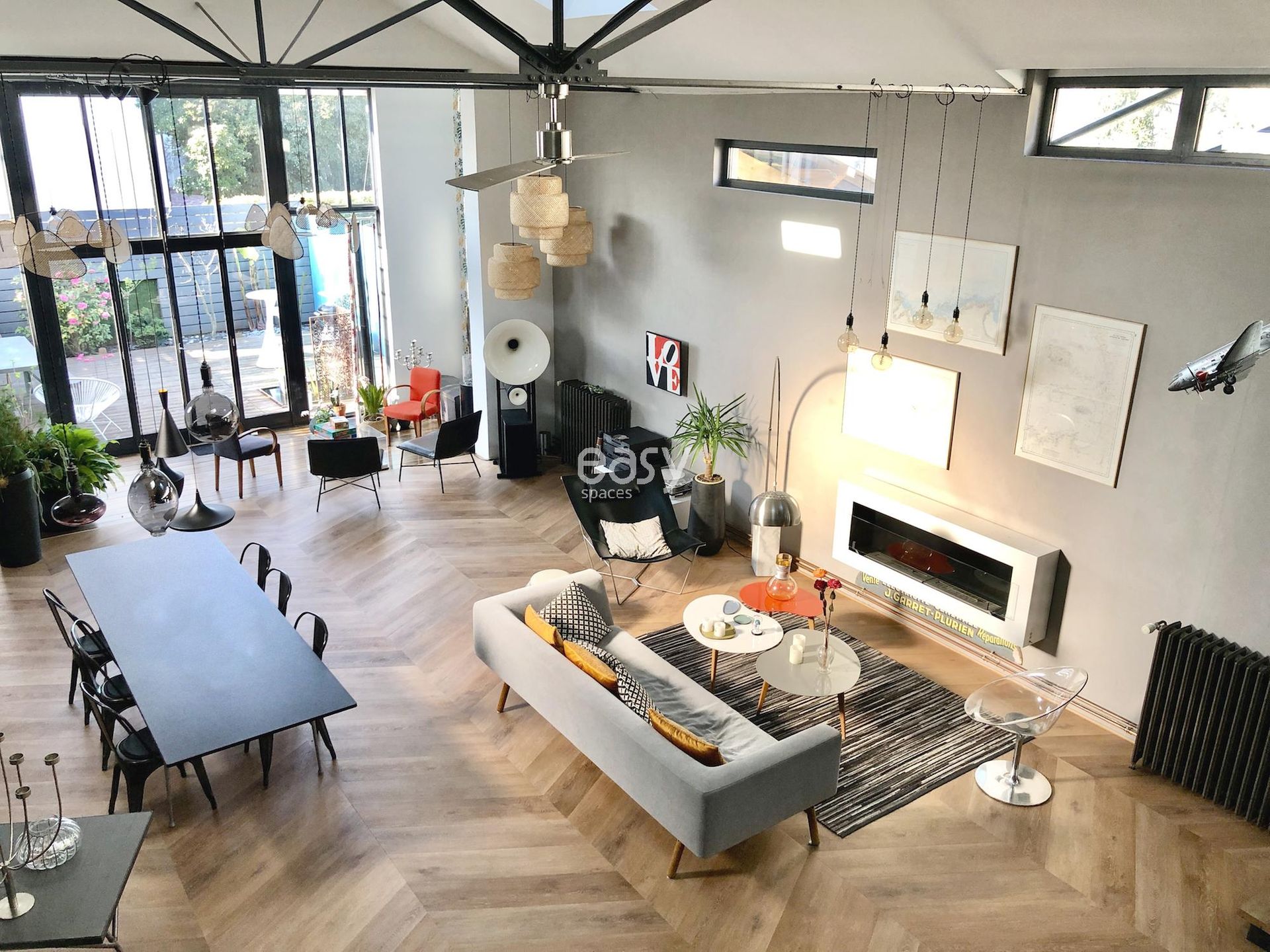 Ce loft de 250m2 près de Paris est un lieu atypique idéal pour shootings, tournages et événements professionnels, offrant un grand espace séjour de 100m2, une hauteur sous plafond de 7m, et un jardin privé.